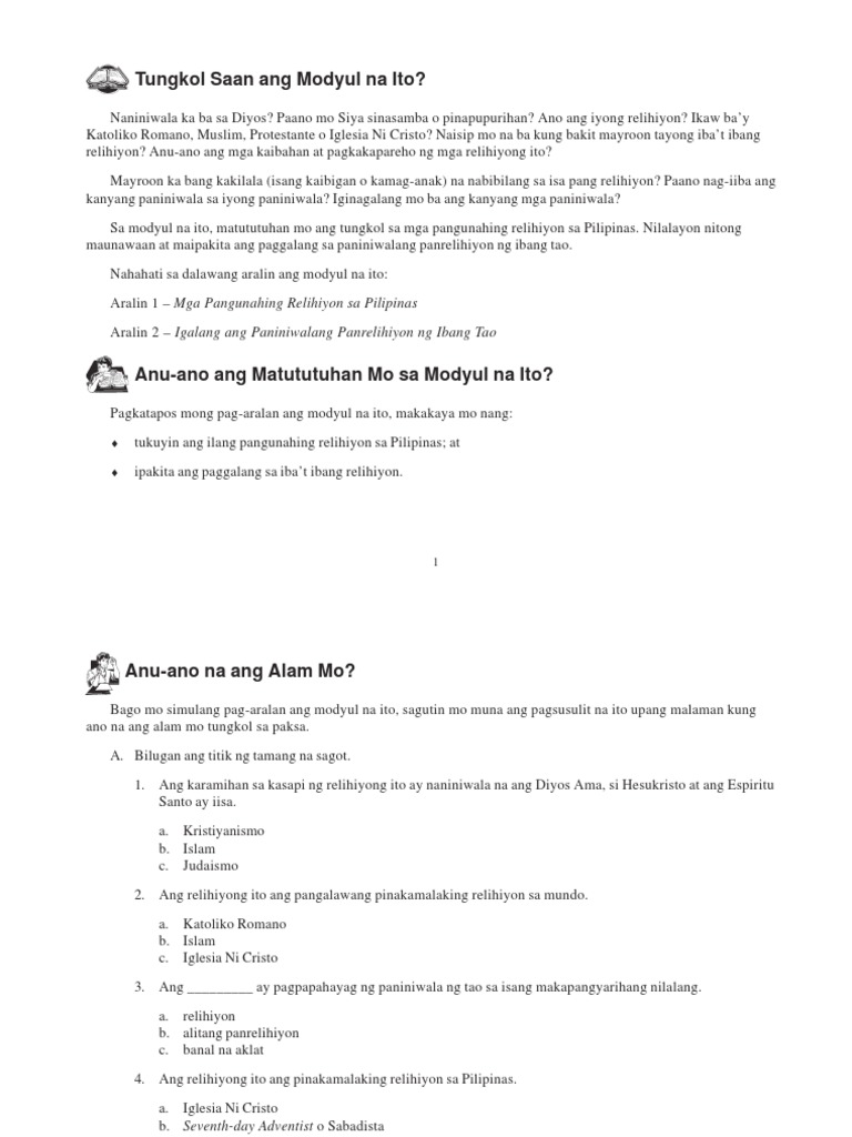 Ilan lahat ang relihiyon sa pilipinas. May mga taga sunod ang mga relihiyon na ito sa ibat ibang sulok ng daigdig hindi lamang. Ang mga Muslim ay naghihintay din sa pagbabalik ni Hesus. Narealize kong isa ang pagdadasal sa mga pangunahing aktibidades ng isang mananampalatayaMahalaga ito dahil pamamaraan ito upang kumonekta ng diretso sa isang pinaniniwalaang diyos o entity.
