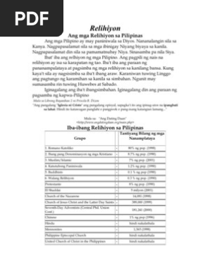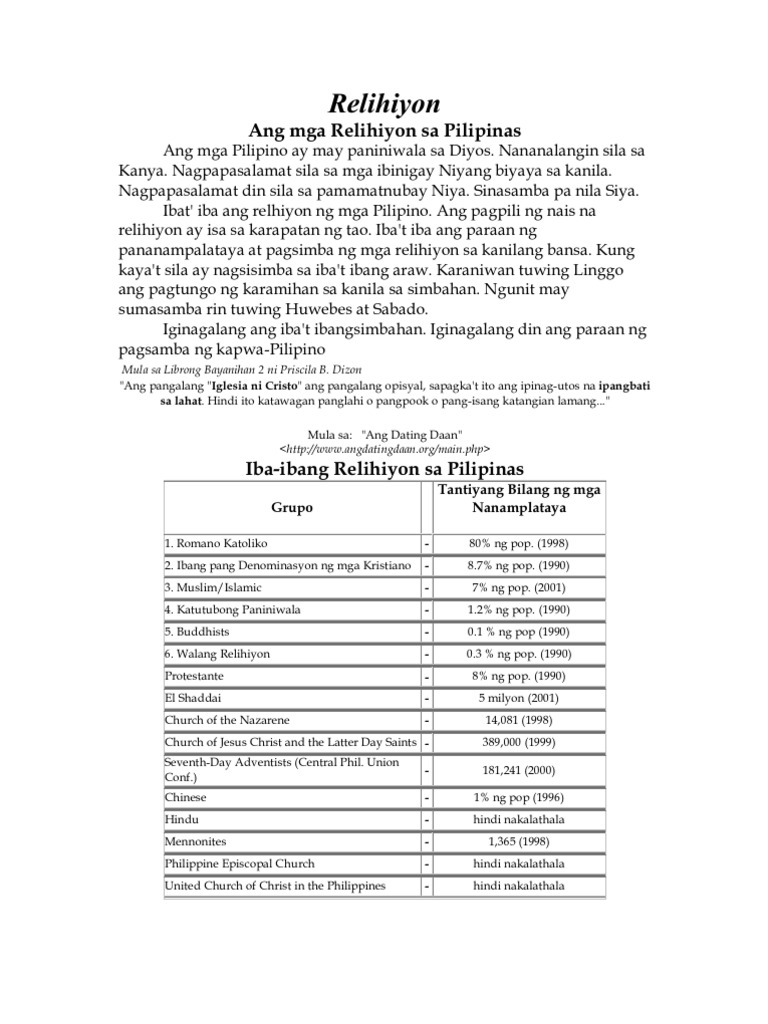 Ang maraming mga relihiyon ay may mga mitolohiya mga simbolo mga tradisyon at mga sagradong kasaysayan na nilalayon na magbigay kahulugan sa buhay o ipaliwanag ang pinagmulan ng. Noong 2015 mayroon nang labimpitong 17 rehiyon at ang mga ito ay nahahati sa walumput dalawang 82 lalawiganNabuo ang mga rehiyon upang pangkatin ang mga lalawigan na may pareparehong katangiang kultural at etnolohikal. Ilan ang relihiyon sa pilipinas.