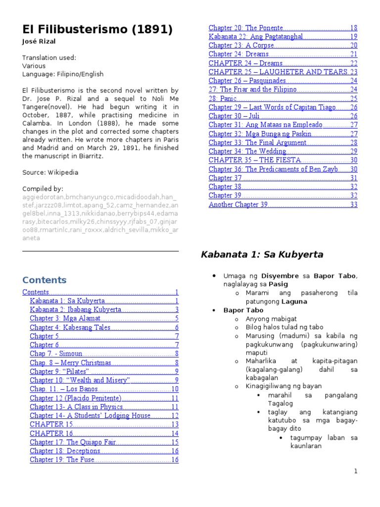 El Filibusterismo Buod Ng Bawat Kabanata 1 39 With Talasalitaan