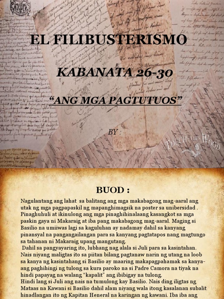 KABANATA 26-30 ANG MGA PAGTUTUOS BY. Buod Maagang nagbangon si Basilio upang magtungo sa ospital. Ang nobelang ito na kilala sa Ingles na The Reign of Greed ay isa sa dalawang magkadugtong nobela na isinulat ng ating pambansang bayani na si Jose Rizal buong pangalan ay Jose Protacio Mercado Rizal Alonzo y.