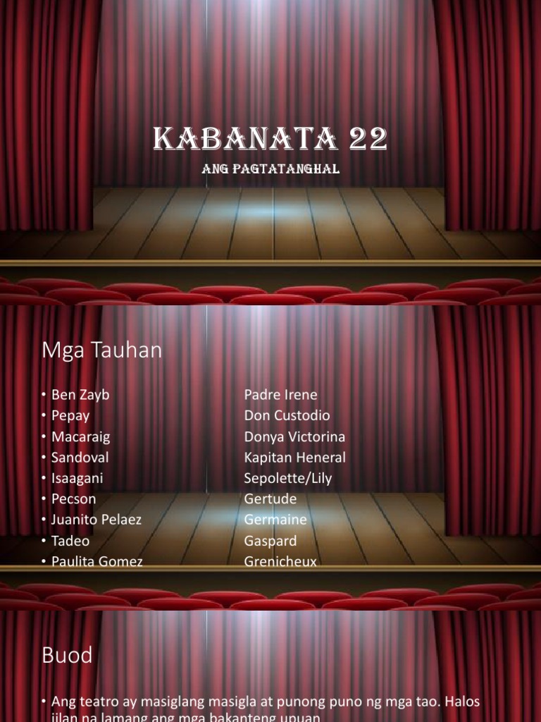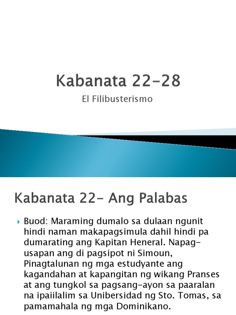 28012020 Kabanata 22 El Filibusterismo Ang Palabas BUOD KABANATA 22 EL FILIBUSTERISMO Narito ang buod ng Kabanata 22 ng El Filibusterismo na isinulat ni Jose Rizal. Halos iilan na lamang ang mga bakanteng upuan ngunit hindi makapagsimula ang palabas sapagkat hinihintay ang Kapitan Heneral. Hindi lamang ito karapatan bilang isang tao bagkus ay para rin sa kalayaan ng pang-unawa at kaisipan.